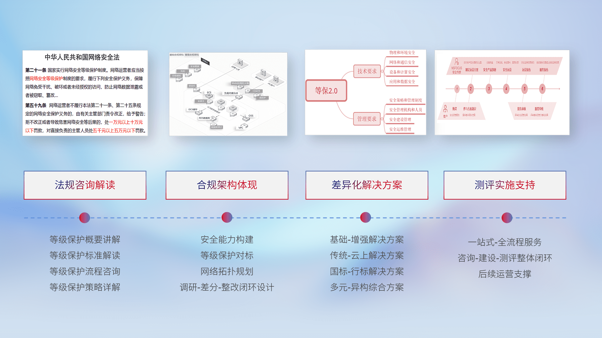 通过专业的法律咨询解读、、、、合规架构体现、、差异化解决方案、、、、测试实施支持等服务,,为客户量身打造等保合规体系。。。。